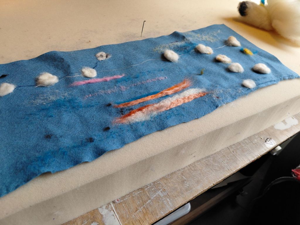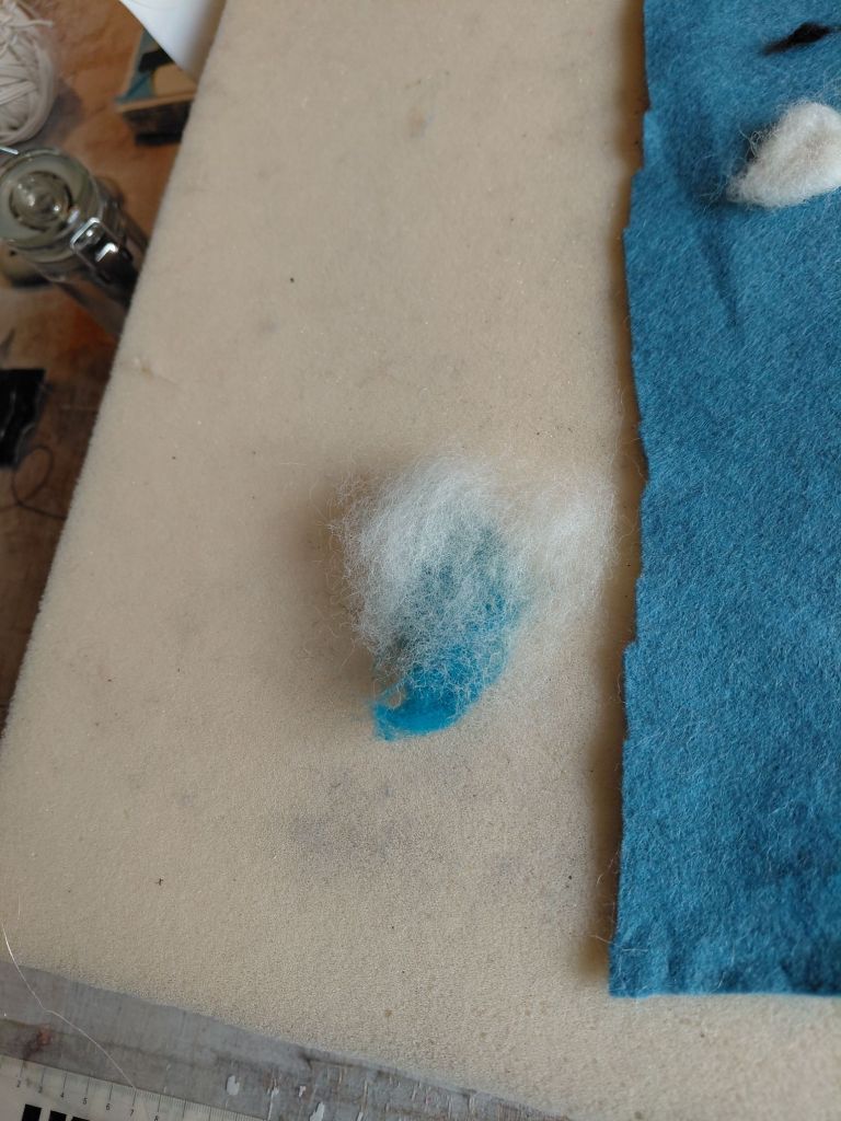This noon after having Coffee and a pancake next door, and doing shopping for tomorrow I going on with this clouds the cotton sewing thread fits pretty good; for now. Let’s hope it will stuck during the washingproces