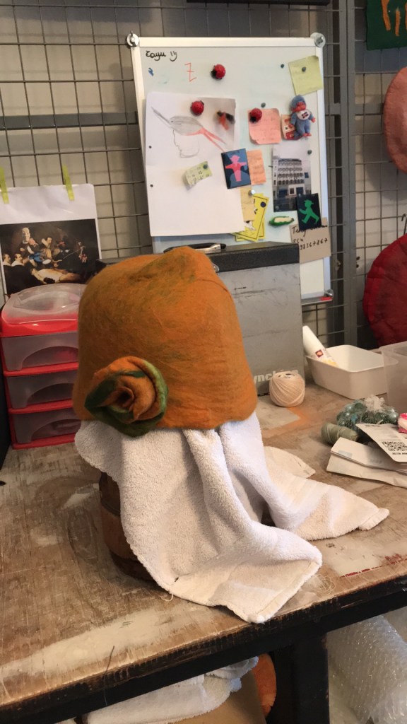 This afternoon I made a hat in a jiffy with Fiew green accents and orange felt